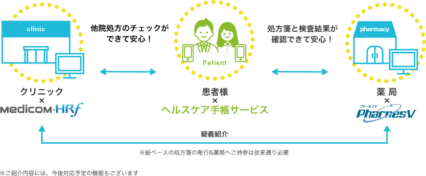 ヘルスケア手帳を介して電子カルテ・薬歴データを活用し、日々の業務をサポートします。