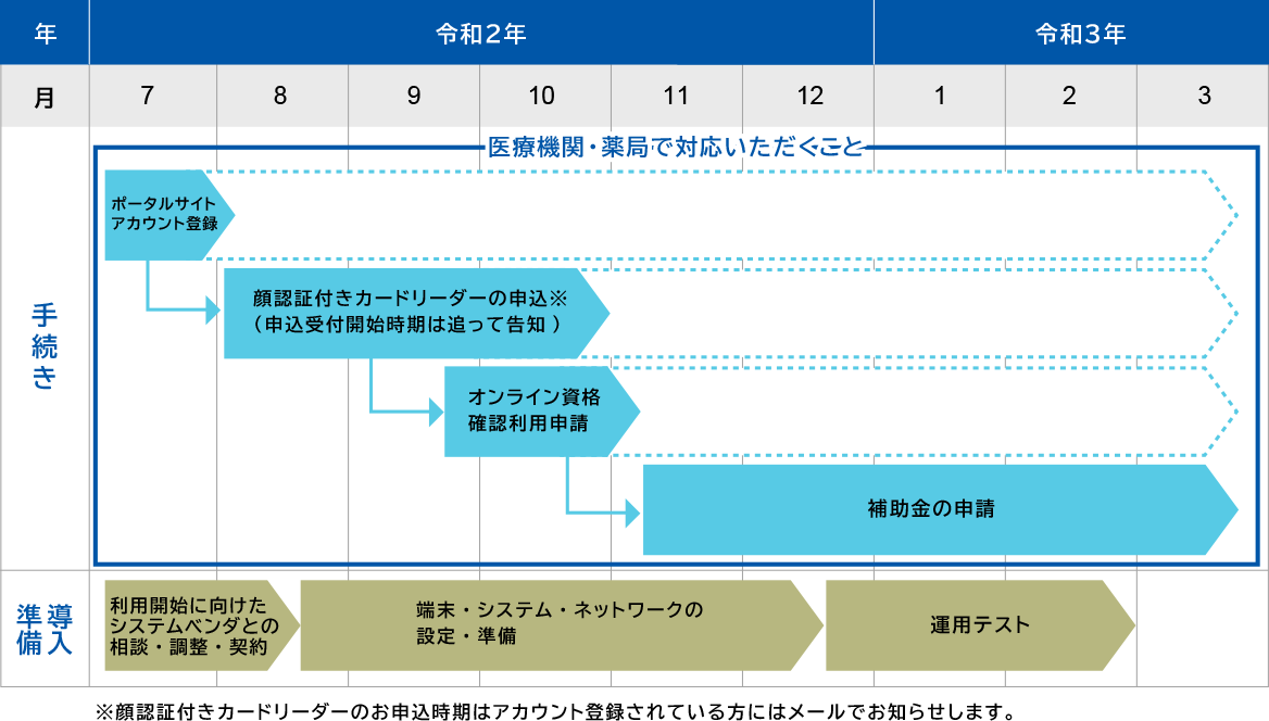 顔認証付きカードリーダーの提供や、システムベンダ(現在ご利用のレセプトコンピュータ等の業者)の現地作業までに期間を要するため、お早めにポータルサイトでのお申し込み/システムベンダへの発注をお願いいたします。
