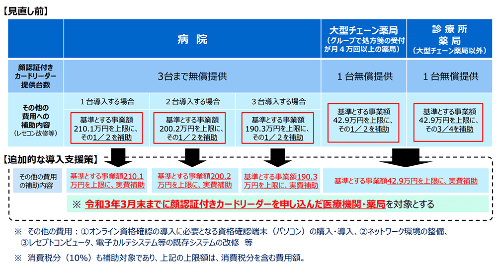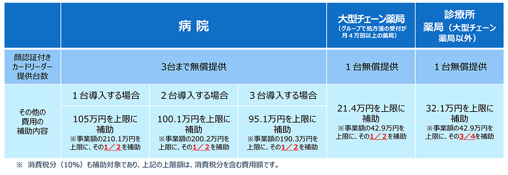 顔認証付きカードリーダーは、医療機関及び薬局に無償提供(病院3台まで、診療所等1台)されます。それ以外の改修等にかかる費用については、補助金の申請が可能です。