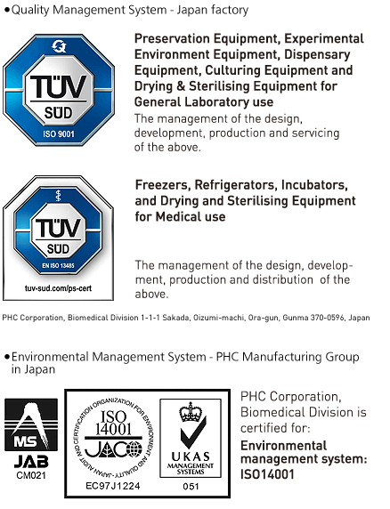 The PHC employees are engaged in the development, quality assurance, and production of products of PHCbi. Within the facility, we have many environmental testing laboratories, and these are used for stringent product screening with the aim of studying technology development and maintaining quality.