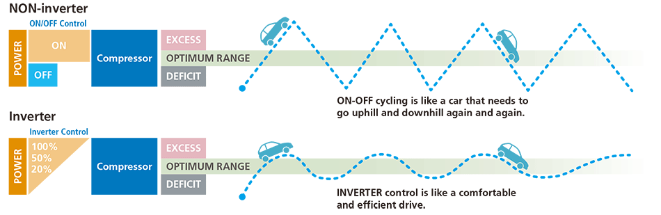 Non-inverter models run at a single speed, turn off, then turn on again. As the start-up of a compressor requires the most energy, repeated ON and OFF cycling causes noise, speeds up product wear out, and frequent energy consumption peaks.