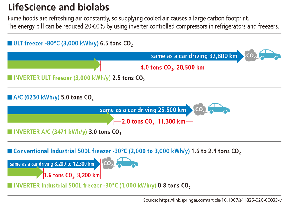 To reduce the impact of CO2 emissions on the environment, transitioning to inverter controlled compressors in refrigerators and freezers can be a start. When looking for energy-efficient laboratory equipment, inverters are one of the key technologies to look for in helping labs cut down on electricity.