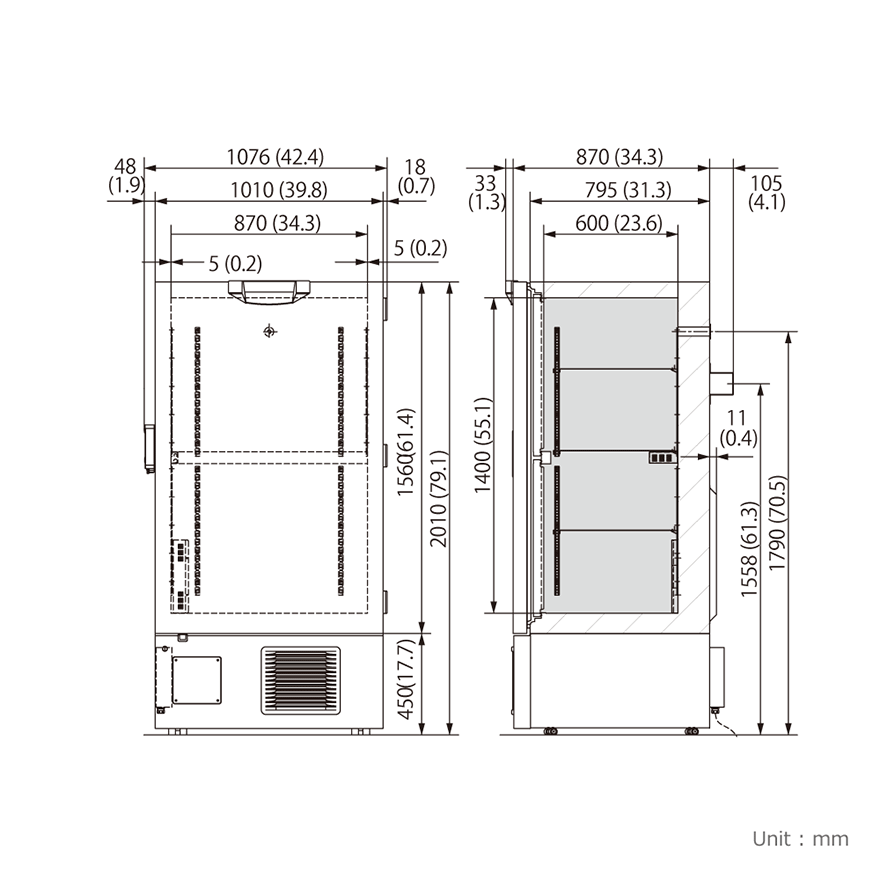 *Cooling performance is indicated by the temperature reached at the center of the freezer (at ambient temperature of 30°C with no load). In order to use the freezer at a stable temperature for a long time, it is recommended that the temperature be set to at least 5°C higher than the indicated lowest temperature.