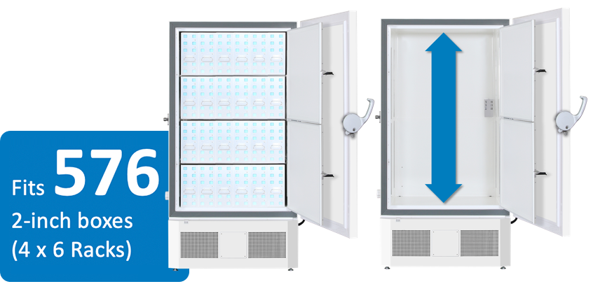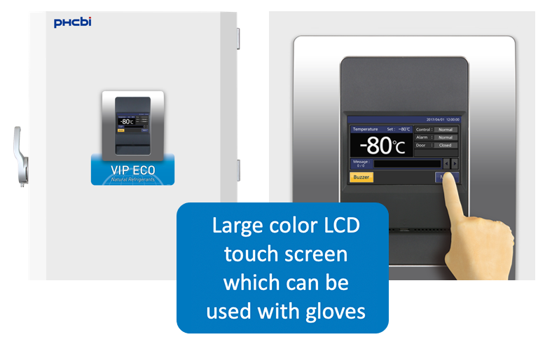 The large color LCD touch screen installed at the middle of the freezer, makes it easy to see the temperature which is displayed in large letters. In addition, the temperature for every 24 hours is displayed as a graph on the screen. It can also be used with gloves on, and a USB port equipped on the side of the screen, makes it possible to extract 1.5 months worth of operation history, which is recorded in 2-minute intervals, as a CSV file in order to manage the operation history on a computer.