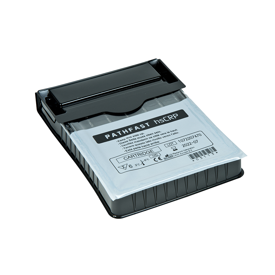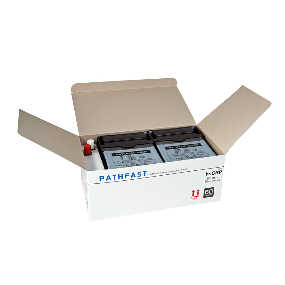 PATHFAST™ hsCRP ist ein Produkt zur In-vitro-Diagnose, das zusammen mit dem In-vitro-Diagnosesystem PATHFAST™ zur quantitativen Messung des C-reaktiven Proteins (CRP) in menschlichem Serum, heparinisiertem oder EDTA-Vollblut und -Plasma, auch bei niedriger Konzentration. Das C-reaktive Protein (CRP) ist ein Akute-Phase-Protein mit einer Molekularmasse von ungefähr 118 000 Dalton. CRP ist hoch konserviert, besteht aus fünf identischen zyklischen globulären Untereinheiten und wird als Mitglied der Pentraxin-Superfamilie von Proteinen klassifiziert. Da erhöhte CRP-Werte immer mit pathologischen Veränderungen einhergehen, bietet der CRP-Assay wertvolle Informationen zur Diagnose, Behandlung und Überwachung von Entzündungen und Begleiterkrankungen. Beim PATHFAST™ hsCRP handelt es sich um einen Assay zur Messung von CRP sogar bei niedrigen Konzentrationen, im Format eines chemilumineszierenden Enzym-Immunoassay (CLEIA). Alle für die Durchführung des Tests erforderlichen Komponenten befinden sich in einer Reagenzkartusche. Wenn PATHFAST™ hsCRP in das In-vitro-Diagnosesystem PATHFAST™ geladen wird, kann CRP innerhalb von 17 Minuten genaustens quantifiziert werden.