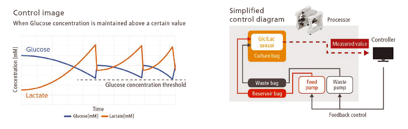 La glucólisis es una de las principales vías del metabolismo energético en las células. Dado que en este proceso se consume glucosa y se produce lactato, los cambios en sus concentraciones son un indicador útil de la vitalidad celular. La bolsa de cultivo está equipada con un sensor en línea que mide la glucosa y el lactato en tiempo real como datos continuos en línea.