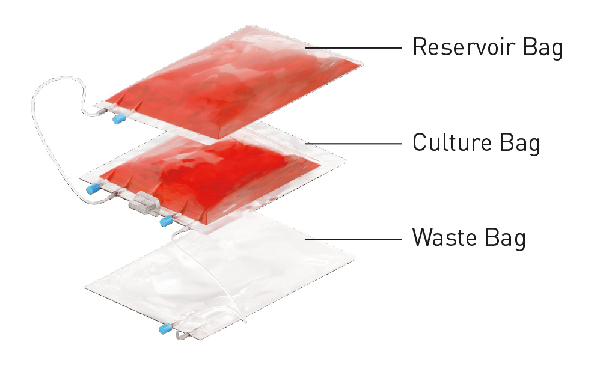 Las bolsas de cultivo con sensores en línea se irradian con rayos gamma antes de su suministro y solo necesitan conectarse al dispositivo para garantizar un entorno estéril que permita cultivos celulares altamente reproducibles.