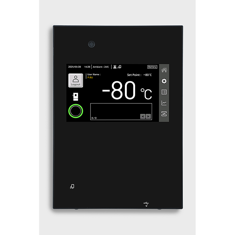 An eye level, door mounted, 10.1 inches high resolution LCD touchscreen allows full user control. A USB port makes transferring logged data to a PC convenient. All performance attributes are displayed and an internal temperature log can be expressed in graphic form over time.