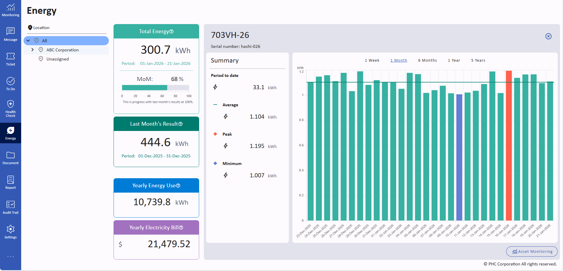 À partir des données de fonctionnement des congélateurs, le système fournit des estimations mensuelles et annualisées ainsi que des indicateurs de tendance sur 30 jours. Les vues hiérarchiques, la recherche et le filtrage, ainsi que les affichages graphiques permettent de comparer facilement les congélateurs, d’identifier les changements dans les conditions de fonctionnement et de soutenir les décisions liées à la réduction des coûts énergétiques, aux rapports ESG, aux audits environnementaux et à la planification du remplacement des équipements.