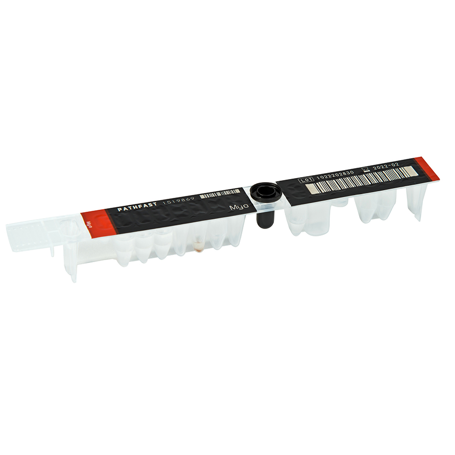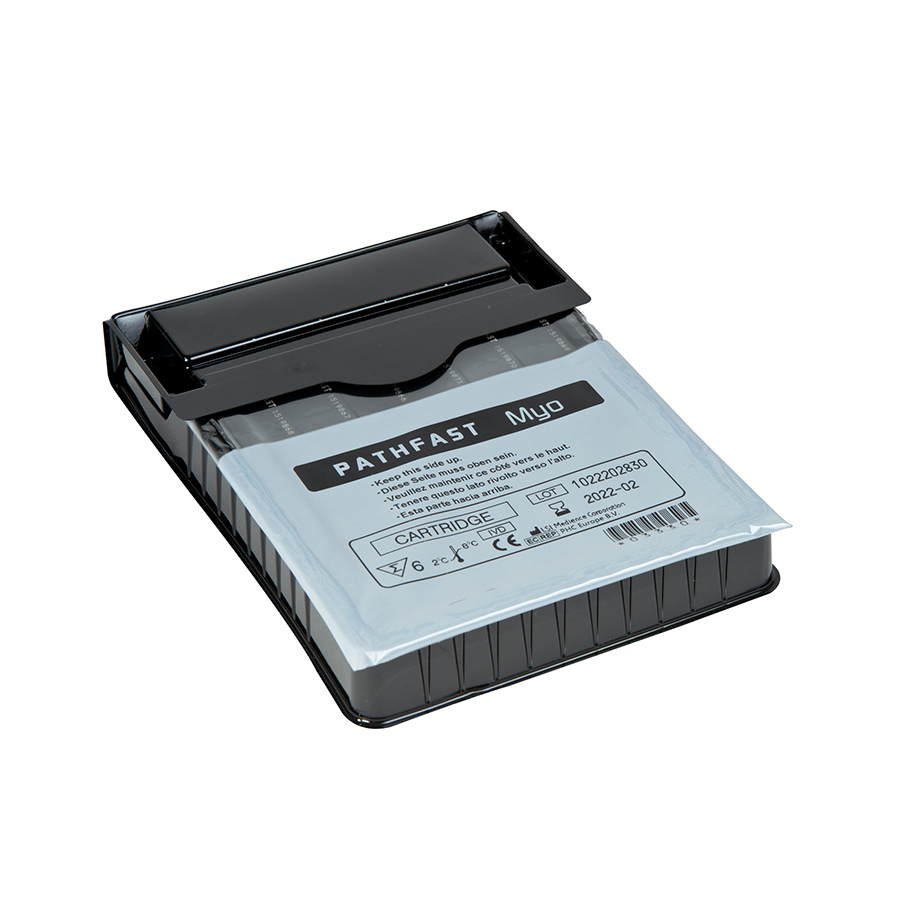 PATHFAST™ Myo est un produit destiné au diagnostic in vitro qui utilise le système de diagnostic in vitro PATHFAST™ pour la mesure quantitative de la Myoglobine dans le sang total et le plasma hépariné. Le résultat obtenu avec ce dosage est utilisé comme aide au diagnostic et permet notamment d’exclure l’infarctus aigu du myocarde. La myoglobine (Myo) est une hémoprotéine de faible poids moléculaire présente à la fois dans le myocarde et les muscles squelettiques. Après une nécrose myocardique associée à un infarctus aigu du myocarde (IAM), la myoglobine est l’un des premiers marqueurs à afficher des taux supérieurs à la normale, avec une augmentation mesurable par rapport aux valeurs de référence dans les 1 à 3 heures suivant l’infarctus, un pic entre 6 et 12 heures et un retour aux valeurs de référence dans les 24 à 36 heures. En l’absence de traumatisme des muscles squelettiques ou d’autres événements associés à une augmentation non cardiaque de la myoglobine circulante (par exemple, une insuffisance rénale), la mesure de la myoglobine dans le sang est utilisée comme marqueur précoce de l’IAM. Plusieurs études ont établi que la mesure de la myoglobine peut être utilisée comme test rapide et sensible dans la phase précoce de l’IAM permettant son diagnostic en conjonction avec l’ECG et pour exclure un infarctus du myocarde chez les patients présentant une douleur thoracique aiguë, en particulier après un second test négatif une heure plus tard.