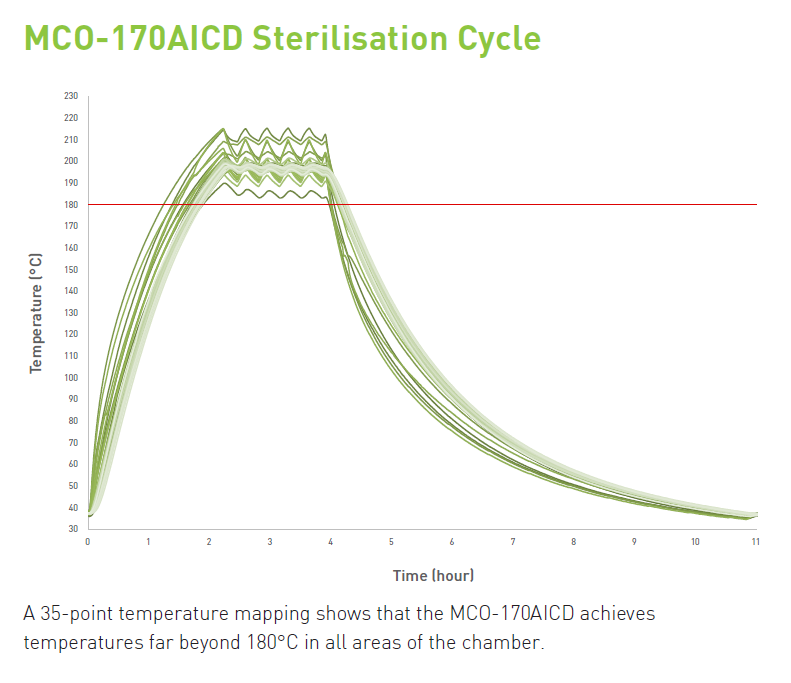 Per evitare ustioni durante il ciclo di sterilizzazione la porta esterna viene bloccata elettronicamente. Durante il ciclo di sterilizzazione, la temperatura della superficie superiore dell’incubatore MCO-170AICD è di circa 60 °C e, pertanto, è entro i limiti di tolleranza previsti dall’International Safety Standard IEC61010 10.1 relativo ai limiti di temperatura per le superfici per la prevenzione delle ustioni (Surface temperature limits for the burn prevention). Il limite di sicurezza per le superfici esterne in metallo è di 65 °C.
