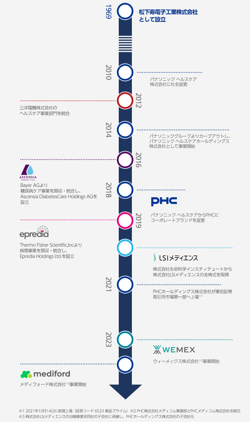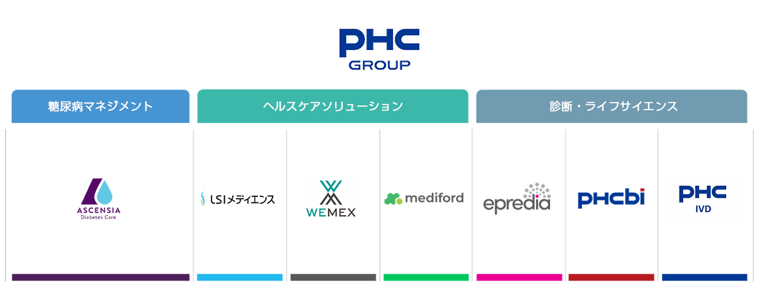 企業情報 会社概要 PHCグループは、診断、医療機器、デジタルヘルス、ライフサイエンス分野で、研究から診断、治療、予防まで幅広く医療に関わるお客さまにベストインクラスの製品・サービスを提供します。患者さまへの医療アウトカムを最大化し、個々の治療に合わせて医療コストを最適化する「バリューベース・ヘルスケア」の実現に貢献していきます。 詳細はこちら 連結売上収益 3,616億円※1 従業員数 9,041名※2 関係子会社数 世界86社※3 事業展開 125以上の国と地域で販売※2 ※1:2024年度、為替レート:1US$=152円/1ユーロ€=164円 ※2:2025年3月時点 ※3:PHCホールディングス株式会社を含まない(2025年3月時点) グローバルに展開するPHCグループの事業 コーポレート映像 会社案内冊子 会社概要プレゼンテーション 中期経営計画 社外からの評価 PHCグループは、糖尿病マネジメント、ヘルスケアソリューション、診断・ライフサイエンスの各分野で製品やサービスを提供する複数の事業会社で構成されています。私たちは、様々な疾病領域や、今日の世界が直面する医療の深刻な問題に対し、ソリューションを提供すべく日々取り組んでいます。私たちのソリューションは、世界125以上の国と地域で患者さまや医療従事者、研究者の皆さまにご活用いただいております。 ENVIRONMENT環境活動 医療機関等との透明性に関する指針 HUMAN RIGHTS POLICY人権方針 CODE of CONDUCT行動規範