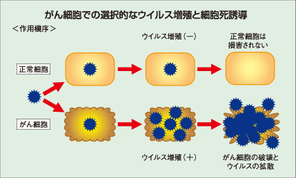 がん細胞での選択的なウイルス増殖と細胞死誘導イメージ