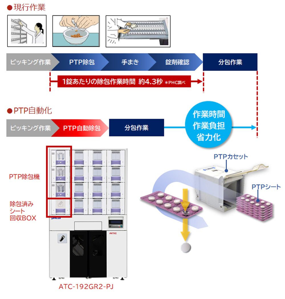錠剤ハサミを使う“ハンドカット” は、1錠剤あたりの作業時間が約4.7秒*かかるといわれています。PHCbiのATCは、自動半錠カット機能を装備した「自動半錠分割TC棚」をオプション設定。独自のカット機構で、半錠カット専用機では実現でいないハンドカットに近い分割精度を実現。今お使いのPHCbi製錠剤包装機に追加することも可能です。