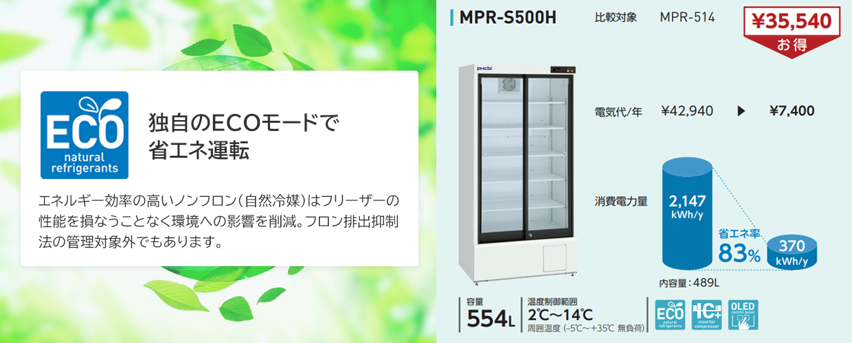 環境への負荷を最小限に抑えるため自然冷媒が使用されており、ワクチン、薬品、薬剤の保存にも