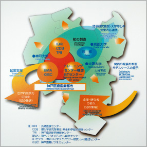 神戸市では先端医療技術の研究開発拠点を整備し、産学官の連携により医療関連産業の集約を図る目的で神戸ポートアイランドに知的クラスターを形成してきました。また2006年2月に開港の神戸空港と、神戸市中心部との中間地点というロケーションを活かし、国内外へのネットワークづくりも積極的に行われています。とりわけ、大阪北部に形成された彩都(京都大学・大阪大学などの研究機関を中心にすえた知的クラスター)との連携強化で「関西広域クラスター」というスーパークラスターの形成が進んでいます。