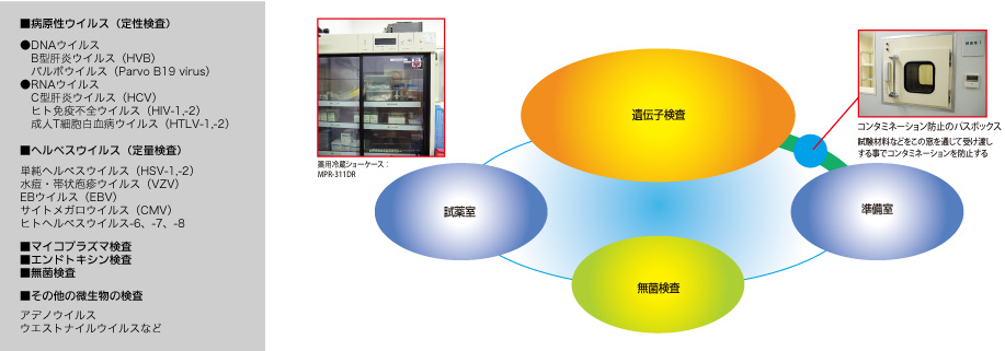 たとえば、病原性ウイルスではDNAウイルスのB型肝炎ウイルス(HVB)、パルボウイルス(Parvo B19 virus)、RNAウイルスのC型肝炎ウイルス(HCV)、ヒト免疫不全ウイルス(HIV-1,-2)、成人T細胞白血病ウイルス(HTLV-1,-2)。ヘルペスウイルスの単純ヘルペスウイルス(HSV-1,-2)、水痘・帯状庖疹ウイルス(VZV)、EBウイルス(EBV)、サイトメガロウイルス(CMV)、ヒトヘルペスウイルス-6、-7、-8などです。ウイルス以外ではマイコプラズマ、エンドトキシンなどの検査もします。その他、アデノウイルス、ウエストナイルウイルスなども対象です。