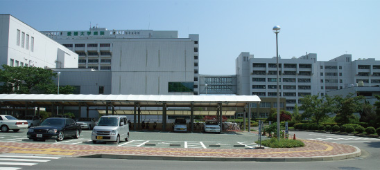 愛媛大学附属病院(左)と教室、研究室などがある医学部本館(右)は渡り廊下で結ばれている