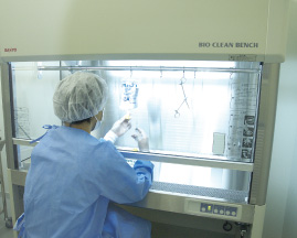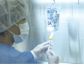 無菌調剤室ではTPN、末梢静脈点滴・経腸栄養法などに対応できる薬剤のほか痛み止めの麻薬や抗ガン剤などの調剤・調製が可能です。すべて医師の処方箋の指示に基づいて調剤・調製します。調剤・調製のためにはクリーンルームの設置が必須となります。当社が導入したクリーンルームはクラス10000の性能の無菌室です。さらに内部に設置したバイオクリーンベンチを使い高度な無菌環境の中で作業を行っています。病院・医師からの処方箋を一方通行的に処理するだけではなく、現場の生きた情報をフィードバックすることで医師と話し合いながら、患者さんに合わせた調剤・調製に取り組んでいます。より適切な処方のためにお医者様にアドバイスすることもあります。