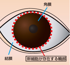 ヒトの眼の白目に当たる部分を結膜といいます。黒目に当たる部分が角膜です。この角膜を覆う部分が上皮細胞ですが、角膜と結膜の境界のリング状の輪部組織に幹細胞が存在し熱傷や疾病でこの部分が損なわれて幹細胞が障害を受けると角膜上皮を作れなくなり失明に至ります。このような症例では角膜移植手術での対応が難しい場合があります。そこでドナーから提供された角膜上皮幹細胞を培養して幹細胞が存在する上皮細胞シートをつくり角膜全面を覆うように移植する技術を開発しました。この術式では移植後早い時期から上皮化と上皮幹細胞の再供給を得ることができます。去年11月に移植手術した患者さんは術後3ヶ月の段階で経過は良好です。
