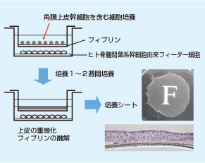 培養上皮シートの調製方法として当医学部の福田恵一教授らが開発したフィブリンシートの技術を用いたこと。シートを作成する上で補助となる細胞=フィーダー細胞には従来マウス由来の細胞が使われていましたが、これを米国において安全性が確認されているヒト骨髄間葉系幹細胞に替えて二種類の幹細胞の調製となったこと。また、培養液はプリオンの汚染を避けBSE無発症国の安全確認の取れたウシの血清を使うこと、などが特徴です。