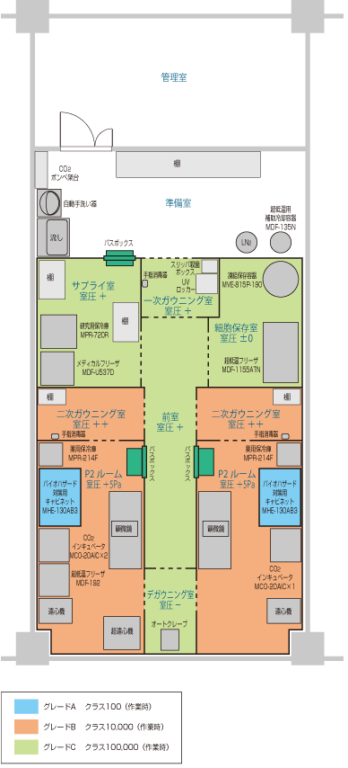 ヒト幹細胞を調製するわけですから高度な安全性の担保としてGMP準拠の品質が要求されます。CPCに関する書類については三洋さんにも協力いただきました。CPC内の作業に関しては作業手順書というものを策定し培養の工程をその手順に沿って管理しなければならないのですが、たとえばCPCで作業する場合は必ず二人体制で入室することになっていて、ひとりが作業し残りのひとりがその作業の記録を取ります。同時に監視カメラでも撮影し映像記録も残します。これらの記録は長期のものでは30年間の保管が義務付けられています。そして作業を終えるとその都度無菌性を維持するため清掃及び環境微生物のモニタリングを行います。