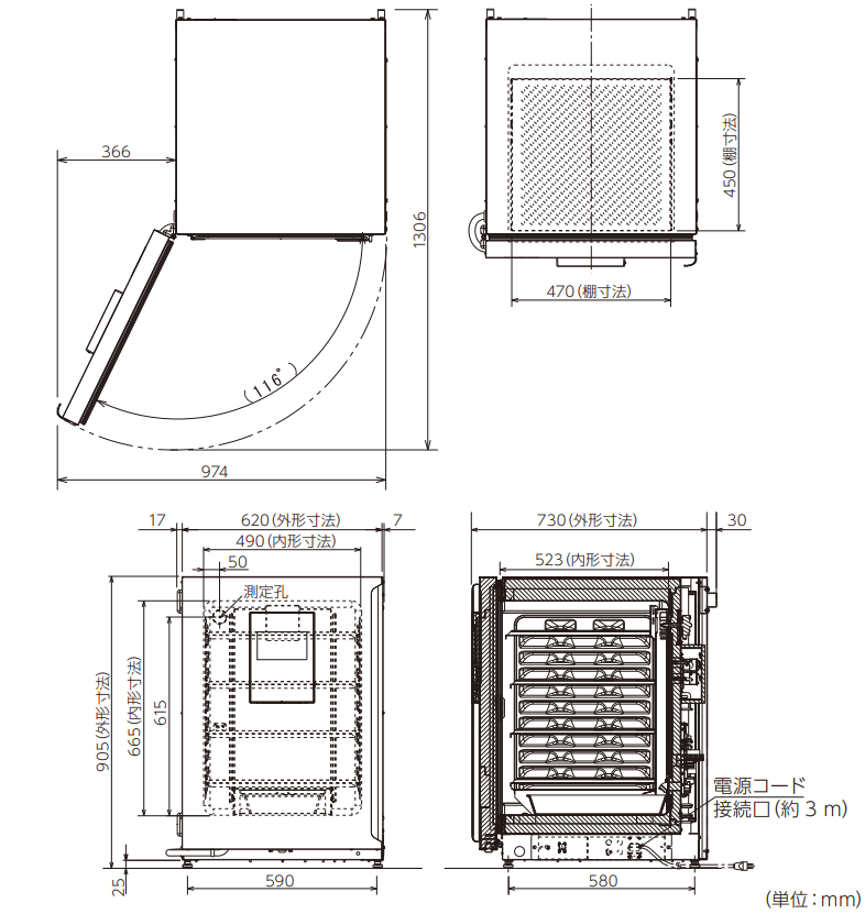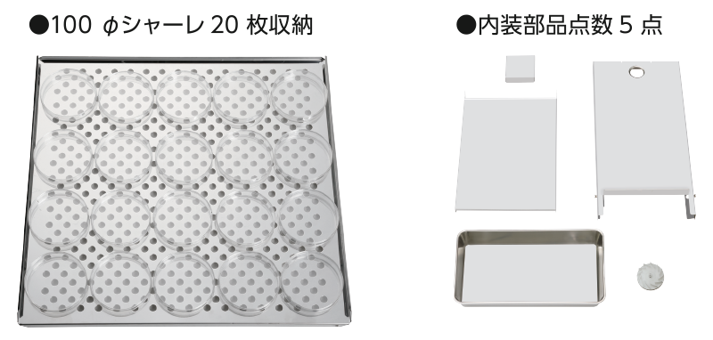 ステンレス鋼板(銅含有)、標準4 枚(最大10 枚) 内寸法:W470 ㎜×D450 ㎜×H12 ㎜ 多段調節式、耐荷重:7 kg