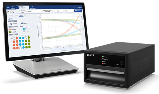 まず、細胞を測定する前に、グルコースと乳酸の検量線を作成するために2種類の濃度既知培地を測定し校正を行います。測定中は、培地交換や継代、試薬の添加など通常の培養作業が可能です。測定データは1分おきに取得され、そのデータをもとに15分おきの代謝速度のデータを導出することができます。