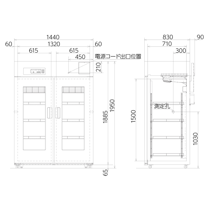 測定孔 3 ヵ所 庫内天面・左右側面(各孔Φ30 mm)