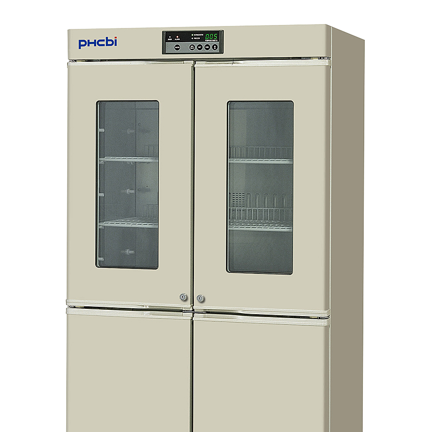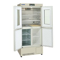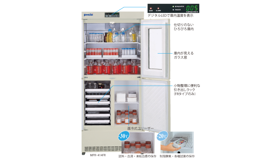 2℃〜14℃の薬用保冷庫と、−30℃の冷却能力を持つメディカルフリーザーを一体化したユニークな構造が特長です。幅広い温度域により、要保冷(15℃以下、禁凍結)や要冷蔵(2℃〜8℃)の薬品をはじめ、試薬や制限酵素、凍結血漿などの保存(−20〜−30℃)まで、多目的に利用できます。