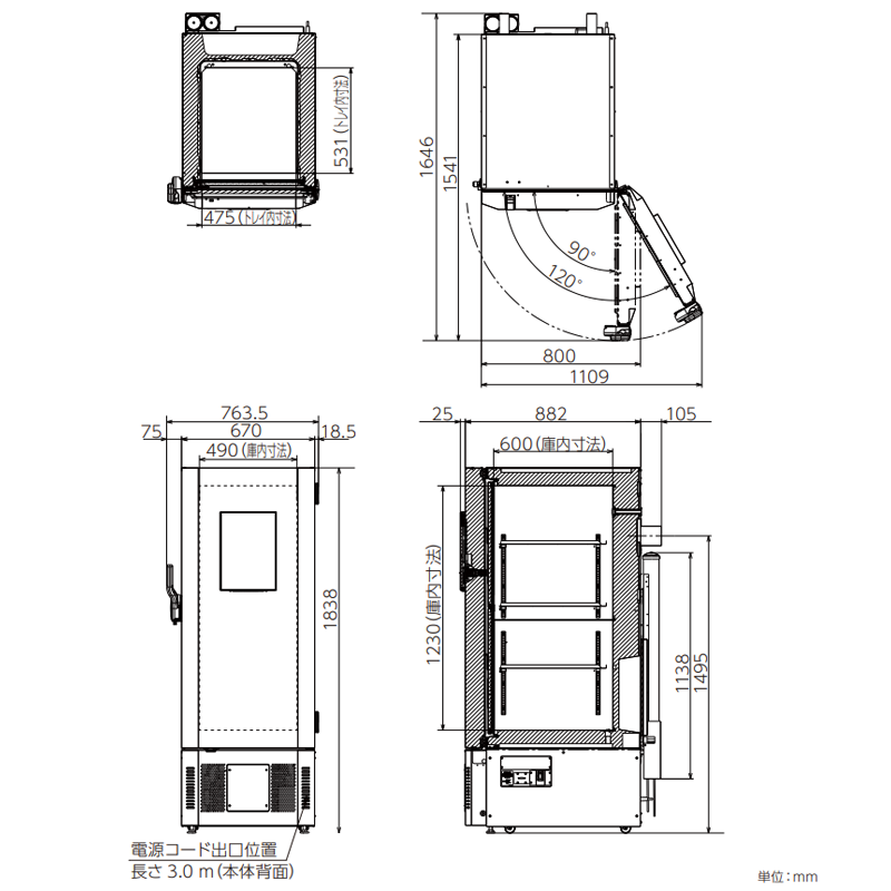 設定温度-40 ℃~-5 ℃(初期設定-10 ℃) ステータスインジケータ―橙点滅 庫内温度表示点滅、二次元バーコード表示 約15 分遅延後、ステータスインジケータ―赤点滅、ブザー断続音、遠隔警報出力、二次元バーコード表示
