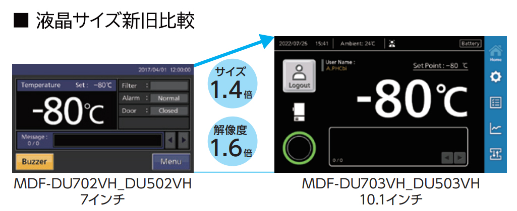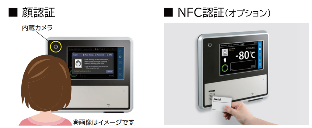 設定温度-5 ℃ ~ -40 ℃(初期設定-10 ℃) 警報設定範囲外でAlarm表示文字点滅・庫内温度表示点滅・約15 分遅延後Warning表示・ブザー断続音・遠隔警報出力