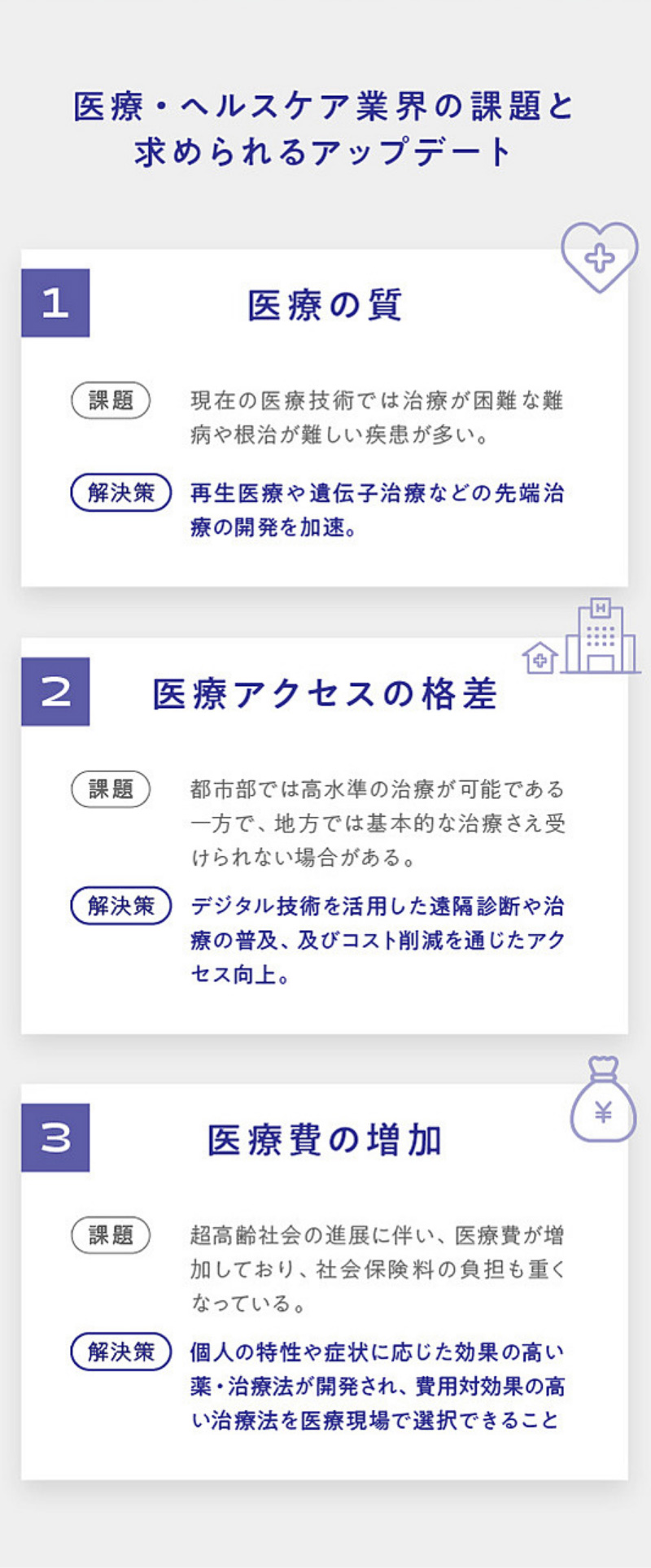 一つ目は、「医療の質」です。昨今、医療技術の進化は加速しているものの、それでも治療方法が見つからない難病や根治が難しい疾患が数多くあります。