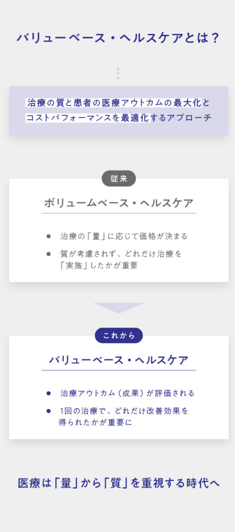従来のような全体最適型の治療ではなく、患者さん一人ひとりに個別最適化した医療を提供すること。また同時にコストの最適化を実現することも求められるなか、「バリューベース・ヘルスケア」と呼ばれるアプローチが医療改革のカギになると考えています。