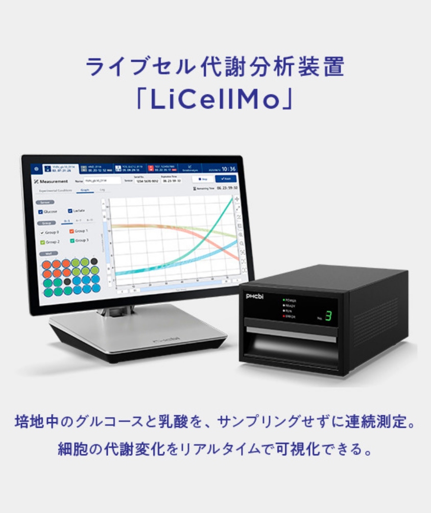 当社グループが提供する「LiCellMo」は、独自の高精度なバイオセンシング技術を活用し、培地をサンプリングしなくても細胞の連続的な代謝変化をリアルタイムに可視化できる研究用の分析装置です。