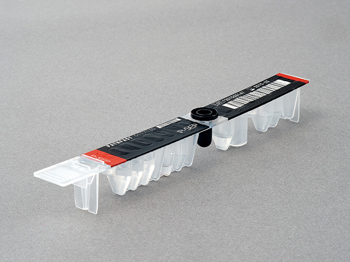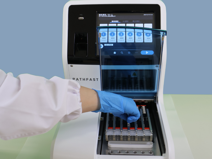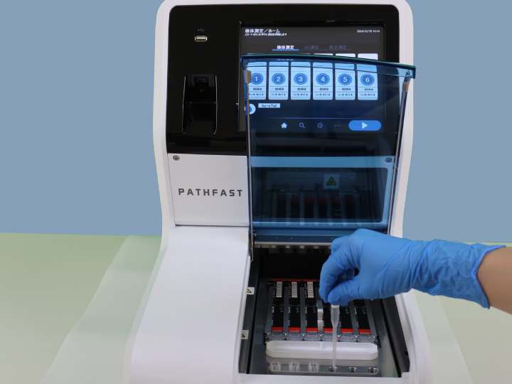 操作手順 試薬概要 試薬カートリッジをカートリッジラックに挿入します。 カートリッジの検体ウェルに(ピペット/スポイトで)検体を添加します。 カートリッジラックをパスファーストにセットします。 カートリッジ毎に専用チップをセットします。 試薬ドアを閉じてスタートを押すと測定を開始します。 約17分後に結果を印字 (項目により異なります)