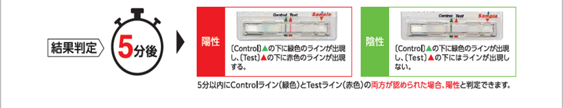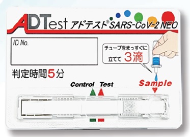 SARSコロナウイルス抗原キットアドテストSARS-CoV-2 NEO アドテスト SARS-CoV-2 NEOとプロラスト® Flu Oneの検体共用 アドテスト SARS-CoV-2 NEOとプロラスト® Flu Oneの使用可能検体 添付文書掲載データ 製品名 鼻咽頭ぬぐい液 鼻腔ぬぐい液 プロラスト® Flu One ○ ○ プロラスト® SARS-CoV-2 Ag ○ ○ 判定時間は5分 新型コロナウイルス(SARS-CoV-2)の抗原を、イムノクロマト法を用いて迅速(5分間)、簡便に検出します。 概要 製造販売元:アドテック株式会社 発売元:株式会社LSIメディエンス 商品コード:225208 テストカード(10枚) 検体抽出液(10本) フィルター付きノズル(10個) 滅菌綿棒(鼻腔用) 簡易スタンド(1つ) 製品名 アドテストSARS-CoV-2 NEO 包装 10テスト 貯法 1~30℃ 反応時間 5分 採取方法 【鼻咽頭ぬぐい液の採取方法】 滅菌綿棒を鼻腔孔から耳孔を結ぶ線にほぼ平行に鼻腔底に沿ってゆっくり挿入し、鼻咽頭を数回擦過して、ぬぐい液を採取します。 【鼻腔ぬぐい液の採取方法】 滅菌綿棒を鼻腔に沿って2cm程度挿入し、鼻甲介付近をゆっくり5回程度回転させ、ぬぐい液を採取します。 *被検者自身が採取する際は、鼻出血が起こりやすい部位である点にも配慮し、医療従事者の管理下で実施してください。 検体の抽出・測定操作方法 綿棒を検体抽出液に浸した状態で、検体抽出部でゆっくり上下させながら5~10回程度回転させてください。 ゆっくりと綿棒を引き抜き付属のフィルター付きノズルをしっかりとはめ込んでください。 チューブをまっすぐ立てて検体滴下部(Sample▼)とノズルの間を約1cm空けて3滴をゆっくり滴下します。 判定方法