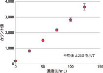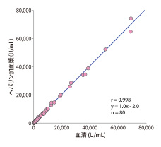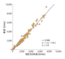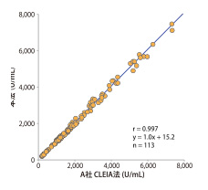 ステイシアCLEIA IL-2R 臨床的意義 非ポジキンリンパ腫(NHL)、成人T細胞性白血病(ATL)の病態、治療効果の判定、経過観察に有用です。 各種データ 測定原理 1Stepサンドイッチアッセイ(CLEIA法) *Applied Biosystems, LLCの商標です 同時再現性 (n=10) (U/mL) 検体 管理検体L 管理検体M 管理検体H Mean 263 1790 27621 Max 280 1882 28888 Min 249 1637 26594 Range 31 245 2294 SD 6.33 52.13 586.67 CV 2.4% 2.9% 2.1% 同時再現性 (n=10) (U/mL) 検体 管理検体L 管理検体M 管理検体H Mean 274 1845 28708 SD 5.87 55.72 623.14 CV 2.1% 3.0% 2.2% オンボード試験 最小検出感度 測定範囲(上限) 112,695U/mLの標準品IL-2Rを含む血清を用いた。 プロゾーン 直線性(検体) 検体種の影響 他法との相関 参考基準範囲 参考基準範囲:121~613U/mL(n=487) (U/mL) Mean 307 Max 768 Min 87 製品概要 商品コード 製品名 構成 包装 756511 ステイシアCLEIA IL-2R (1)検体希釈液(R1) 5.0mL × 1 製品番号 (2)磁性ラテックス試薬(R2) 2.5mL × 1 RM75-651SK (3)酵素標識抗体試薬(R3) 5.0mL × 1 商品コード 製品名 構成 包装 750083 基質液(R5) 基質液(R5) 125mL × 1 製品番号 RM75L-001 商品コード 製品名 構成 包装 756528 ステイシアIL-2R キャリブレーターセット※ キャリブレータ―(5濃度) 液状品 1.0mL×1 ×5濃度 製品番号 RM75S-651SS 商品コード 製品名 構成 包装 756535 ステイシアIL-2R コントロールセット※ コントロール(2濃度)液状品 1.0mL×3 ×2濃度 製品番号 RM75C-651SS ※ロットによって表示値が異なります。