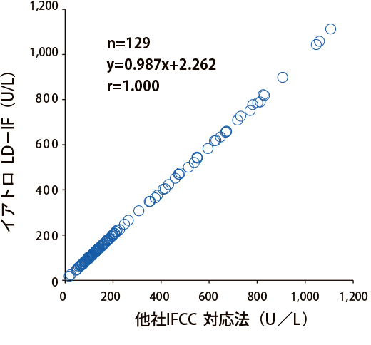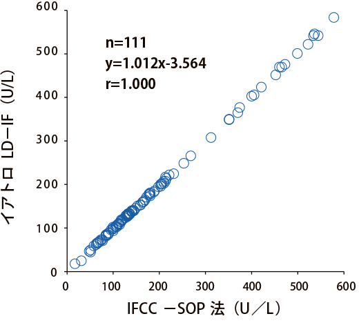 乳酸脱水素酵素キット イアトロ®LD-IF LD-IFとは IFCC標準化対応試薬を用いることで海外と測定値の共有ができ、国際的な臨床試験などに対応できます。また、JSCC標準化対応試薬と比べて健常者の測定値差は軽微であり、現行の共用基準範囲を用いることができます。一方、肝疾患などの乳酸脱水素酵素(LD)5アイソザイム優位検体においてJSCC標準化対応試薬と比べて低値傾向を示します。 測定原理 試薬中の基質L-乳酸は酸化型ニコチンアミドアデニンジヌクレオチド(NAD)の存在下で、検知中のLDによりピルビン酸に変化します。この反応における還元型ニコチンアミドアデニンジヌクレオチド(NADH)の生成速度を測定することでLD活性値を求めます。 相関性 7180形日立自動分析装置での検討結果 オンボードデータ安定性 併行精度(同時再現性) (n=10) (U/L) Sample L Sample M Sample H 平均 61 190 651 最大値 62 191 654 最小値 60 187 646 Range 2 4 8 S.D. 0.6 1.3 3.0 C.V.(%) 1.0 0.7 0.5 直線性 特異性、選択性(共存物質の影響) 基本性能データ7180形日立自動分析装置 製品概要 使用目的:血清又は血漿中の乳酸脱水素酵素活性の測定 商品コード 製品番号 製品名 包装 630354 7C2-03M1-R1 イアトロ LD-IF R-1:60mL×2 630361 7D2-03M1-R2 R-2:15mL×2 840418 7M2-03M1-R1 R-1:540mL×2 840425 7P2-03M1-R2 R-2:140mL×2 800337 LS8-03M1(2) R-1:40mL×2 R-2:10mL×2 770326 TBA-03M1 R-1:52mL×2 R-2:13mL×2 500961 ST-02MX 酵素キャリブレータープラス 「ヤトロン」 1mL×6本 100352 RM100-35 酵素コントロールプラス1・2 「ヤトロン」 1mL×3×2濃度 適応機種の詳細はお問い合わせください