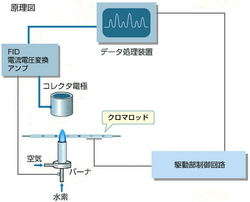 本製品についての「重要なお知らせ」:イアトロスキャン関連製品販売中止 及び 譲渡のご案内 薄層クロマト自動検出装置 イアトロスキャン 測定原理 世界でひとつのTLC-FID法 イアトロスキャン MK-7s TLC(薄層クロマトグラフィー) イアトロスキャン専用の棒状薄層(クロマロッド)上で試料を展開分離させます。 ※展開の様子はイメージです。実際には見えません。 試料を展開分離させたクロマロッドを直接水素炎中で定速移動させます。薄層上で分離した有機化合物が水素炎のエネルギーによってイオン化(炭素イオン)され、FIDの電極間にイオン電流が流れます。この電流値は水素炎中の物質量に比例するため、これを増幅、記録することで定量的な検出測定が行われます。