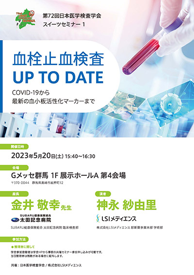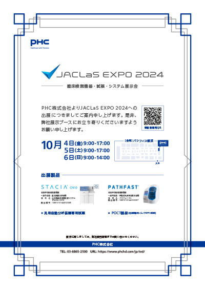 学会・展示会 第65回日本臨床化学会年次学術集会 JACLaS EXPO 2025臨床検査機器・試薬・システム展示会 第26回日本検査血液学会 第74回日本医学検査学会 JACLaS EXPO 2024臨床検査機器・試薬・システム展示会 第73回日本医学検査学会 JACLaS EXPO 2023臨床検査機器・試薬・システム展示会 第72回日本医学検査学会 JACLaS EXPO 2022臨床検査機器・試薬・システム展示会 第65回日本臨床化学会年次学術集会(ランチョンセミナー11) 会期 2025年11月9日(日)12:30~13:20 会場 ウインクあいち 小ホール1〒450-0002愛知県名古屋市中村区名駅4丁目4-38 座長 渡邊 基裕 先生豊川市民病院 診療技術局 臨床検査科 演者 志保 裕行 先生PHC株式会社 JACLaS EXPO 2025臨床検査機器・試薬・システム展示会※終了いたしました 弊社のブースの様子や機器・試薬情報がご覧いただけます。 ご紹介(特定保守管理医療機器) 血液凝固分析装置全自動血液凝固検査システムSTACIA® CN10届出番号:13B1X10144000038 CN10 FILEのご紹介 PATHFAST~想いをカタチに そして全国へ~ ブース設営・ブースのご案内 会期 2025年10月3日(金)~5日(日) 9:00~17:00(最終日は14:00まで) 会場 パシフィコ横浜 展示ホール B,C,D〒220-0012神奈川県横浜市西区みなとみらい1丁目1−1 特設ページ 詳細はこちら 第26回日本検査血液学会学術集会(ランチョンセミナー12) 会期 2025年7月27日(日)11:50~12:40 会場 国立京都国際会館 第4会場 1F Room C1〒606-0001 京都市左京区岩倉大鷺町422番地 座長 中西 加代子 先生滋賀医科大学医学部付属病院 検査部 演者 下仮屋 雄二 先生三重大学医学部付属病院 検査部 第74回日本医学検査学会 ご紹介 ブース設営・ブースのご案内 LPIAジェネシス LG-FDP-P 会期 2025年5月10日(土)~11日(日) 5月10日(土)9:00~17:00 5月11日(日)8:30~15:00 会場 グランキューブ大阪(大阪国際会議場)大阪府大阪市北区中之島5丁目3-51 JACLaS EXPO 2024臨床検査機器・試薬・システム展示会 弊社のブースの様子や機器・試薬情報がご覧いただけます。 機器のご紹介(特定保守管理医療機器) 血液凝固分析装置全自動血液凝固検査システムSTACIA® CN10届出番号:13B1X10144000038 移動式免疫発光測定装置PATHFAST®届出番号:13B1X10144000037 凝固線溶検査についてわかりやすく解説いたします ビリルビンのご紹介 PATHFAST®Multi Control のご紹介 クオリジェネシス®LQのご紹介 イアトロ®フェリチンのご紹介 イムファストチェック HIT-IgGのご紹介 PHC株式会社診断薬事業部の紹介 ブース設営・ブースのご案内 会期 2024年10月4日(金)~6日(日) 9:00~17:00(最終日は14:00まで) 会場 パシフィコ横浜〒220-0012神奈川県横浜市西区みなとみらい1丁目1−1 第73回日本医学検査学会※終了いたしました 公開内容 クオリジェネシス®LQのご紹介 動画を視聴する 機器のご紹介 STACIA® CN10 動画を視聴する PATHFAST® Multi Controlのご紹介 動画を視聴する 機器のご紹介 PATHFAST® 動画を視聴する ブース設営風景・ブースのご紹介 動画を視聴する 会期 2024年5月11日(土)~12日(日) 5月11日(土)9:00~17:00 5月12日(日)8:30~15:00 会場 ホテル金沢2F石川県金沢市堀川新町1-1 JACLaS EXPO 2023 臨床検査機器・試薬・システム展示会※終了いたしました 弊社のブースの様子や機器・試薬情報がご覧いただけます。 公開予定日 公開内容 2023年9月20日公開予定 機器のご紹介 STACIA CN10 動画を視聴する 2023年9月20日公開予定 機器のご紹介 パスファースト 動画を視聴する 2023年9月20日公開予定 イムファストチェック HIT-IgG 動画を視聴する 2023年9月20日公開予定 イアトロフェリチン 動画を視聴する 2023年9月20日公開予定 ブース設営風景・ブース内のご紹介 動画を視聴する 会期 2023年10月6日(金)~8日(日) 9:00~17:30(最終日は14:00まで) 会場 パシフィコ横浜〒220-0012神奈川県横浜市西区みなとみらい1丁目1−1 第72回日本医学検査学会※終了いたしました 弊社のブースの様子や機器・試薬情報がご覧いただけます。 公開予定日 公開内容 2023年5月18日公開予定 機器のご紹介 STACIA CN10 動画を視聴する 2023年5月18日公開予定 機器のご紹介 パスファースト 動画を視聴する 2023年5月18日公開予定 イムファストチェック HIT-IgG 動画を視聴する 2023年5月20日公開予定 ブース設営風景・ブース内のご紹介 動画を視聴する 会期 2023年5月20日(土)~21日(日) 5月20日(土) 9:00~17:00 5月21日(日) 8:30~15:00 会場 Gメッセ群馬〒370-0044 群馬県高崎市岩押町12番24号 スイーツセミナー1血栓止血検査UP TO DATECOVID-19から最新の血小板活性化マーカーまで 座長 金井 敬幸 先生 SUBARU健康保険組合太田記念病院 臨床検査部 演者 神永 紗由里 株式会社LSIメディエンス診断薬事業本部 学術部 開催日時 2023年5月20日(土) 15:40~16:30 会場 Gメッセ群馬 1F展示ホールA 第4会場 参加方法 学会参加登録者は学会HPより事前の共催セミナー参加申込が可能です。 当日整理券は残数がある場合に配布いたします。 JACLaS EXPO 2022 臨床検査機器・試薬・システム展示会※終了いたしました 展示会期間中の弊社ブースの様子をご覧いただけます。 公開予定日 公開内容 10月7日公開予定 ブース設営風景 動画を視聴する 10月7日公開予定 ブース内のご紹介 動画を視聴