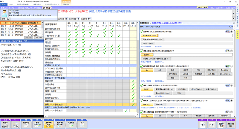 一方で「DrugstarPrime」では、多剤併用患者をすぐに検索できるため、次回の受診時を狙って効率的なポリファーマシー対策の服薬指導が可能になります。また、服薬フォローアップが必要な場合は、あらかじめ入力していておいた予定日にその情報が自動的に表示されて確実にフォローが実行できるなど、患者様に効果的な医療介入ができていると感じます。フォローした内容をベースに自動で服薬情報提供書が作成され、プリントアウトするだけで医師への報告書作成も完了するので、医薬の連携もスムーズにできています。