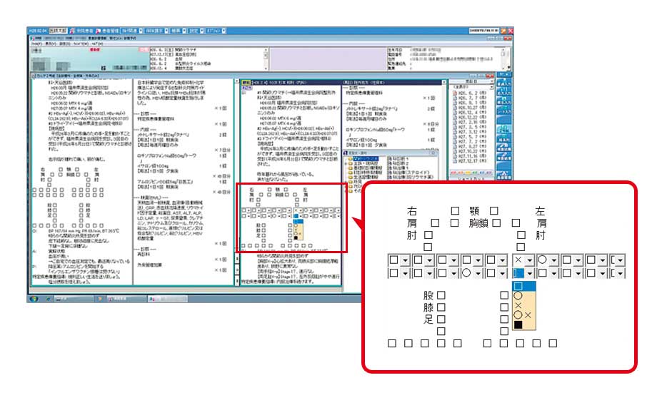 毎回全身の関節の所見をとるという杉本先生は、関節リウマチの疾患活動性指標であるDAS(Disease Activity Score)28を用いて、全身28の関節の腫れ、痛み、その両方といった所見を記載しています。Medicom-HRIIIでの入力方法は、28関節の模式図をテンプレートで作成し、それぞれの部位で腫れや痛みなどの所見を○×などの記号で表し、プルダウンリストから選択入力できるようにしています。「マウスで選択・入力するだけなので、スピーディーな記載ができます」。