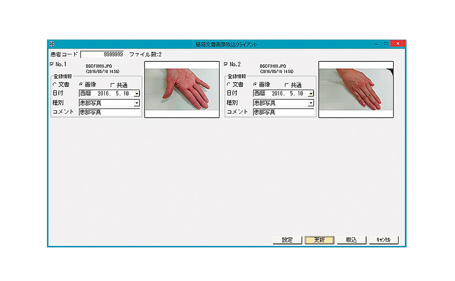 「簡易画像取込」は、皮膚科にはなくてはならない機能。デジタルカメラから無線通信で、自動的に電子カルテに転送・取り込みが可能。