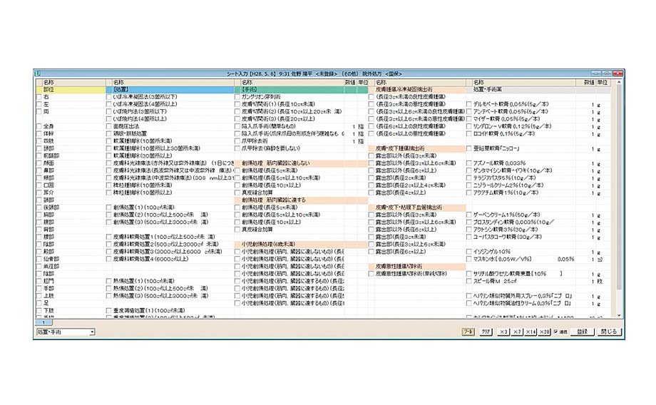 佐野先生が利用する処置・手術のシート画面では、部位、処置・手術内容、処方をそれぞれクリックするだけで、簡単にカルテ記載が可能。