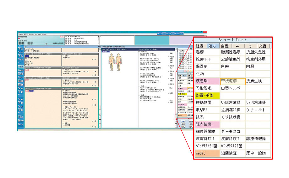よく使う所見や処方などをセット登録しておくと、ショートカット欄からワンタッチで入力可能。工夫次第で多彩なカルテ記載ができる点は、Medicom-HRIIIのメリット。