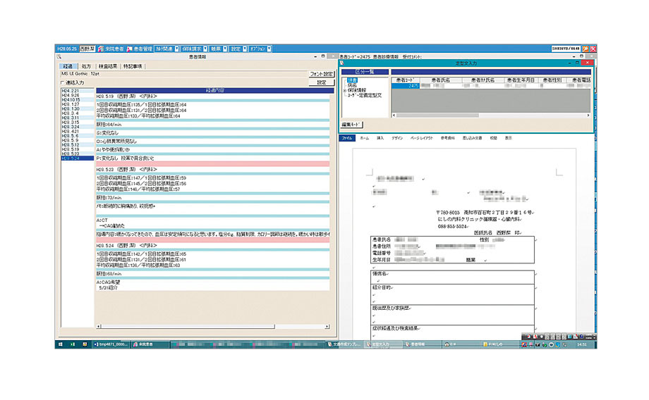 高知市南部の地域医療を支えるため、病診連携・診診連携を重視する西野先生は、 1日最低 5通、多い日は 10通程度の紹介状を書いているといいます。その効率化のために利用しているのが、文書作成機能による紹介状作成です。「紹介先ごとにテンプレートを用意してあるので、頭書情報は自動で入力されるし、処方歴や経過記録は簡単操作で作成中の文書にコピー&ペーストでき、作成時間を大幅に短縮できます」と西野先生。