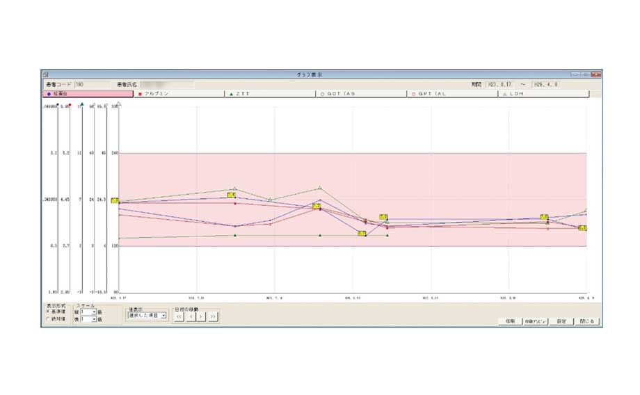 Medicom-HRVは、検査データやバイタルサイン、成長曲線など各種データのグラフ化に対応。患者さんへの分かりやすい病状・治療経過の説明が可能。