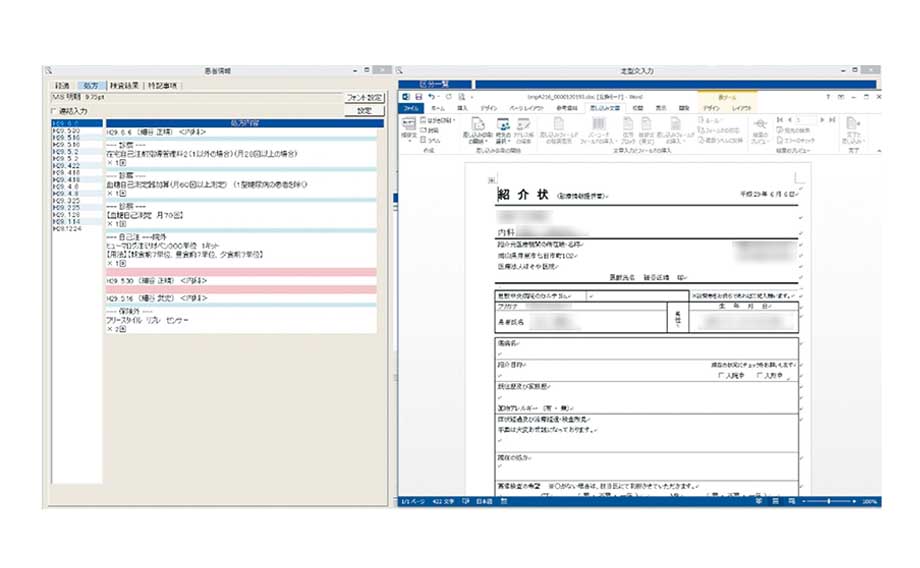 紹介状や主治医意見書などの文書作成をテンプレートで提供。連携先医療機関を選択、基本情報は自動転記、必要項目をコピー&ペーストするだけで素早く作成できます。