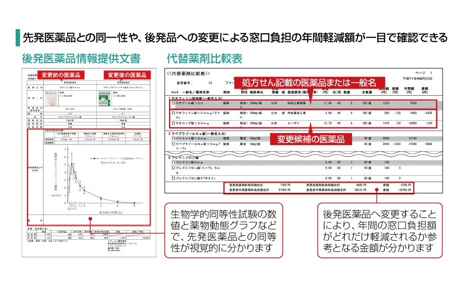 後発医薬品データベースでは先発医薬品との違いが分かりやすく表示されるほか、後発医薬品への変更による窓口負担の年間軽減額を比較した表を簡単に発行する機能も搭載されています(図)。
